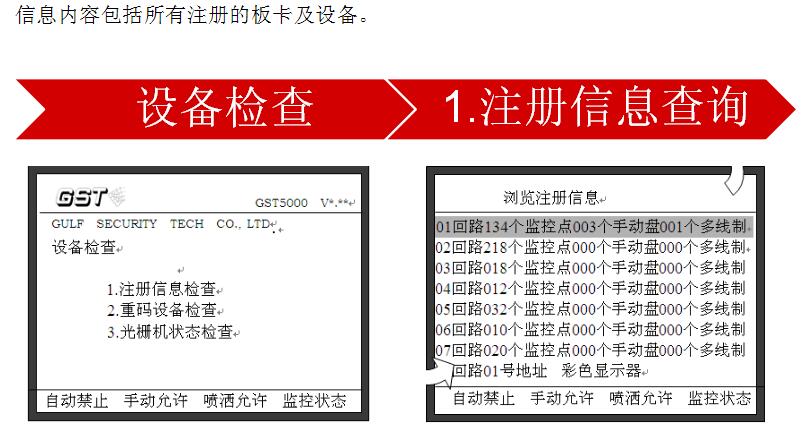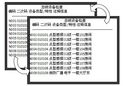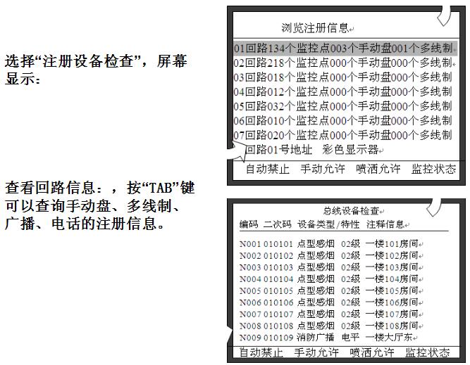 選中某一回路,按下“確認”鍵,將顯示這一回路注冊到的各設備的信息,-上一行的設備高亮顯示;按任意數字鍵高亮消失,控制器處于總線設備檢查狀態